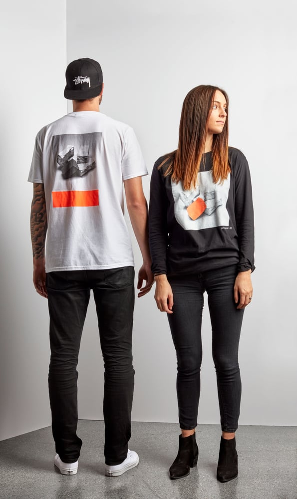 WHITE TEE: Front art is a neon orange left chest. Names of the 4 influencial venues that helped grow the underground techno scene in the late 90s and early 2000s. Back art reveals the cover of the EP and a neon orange brick.